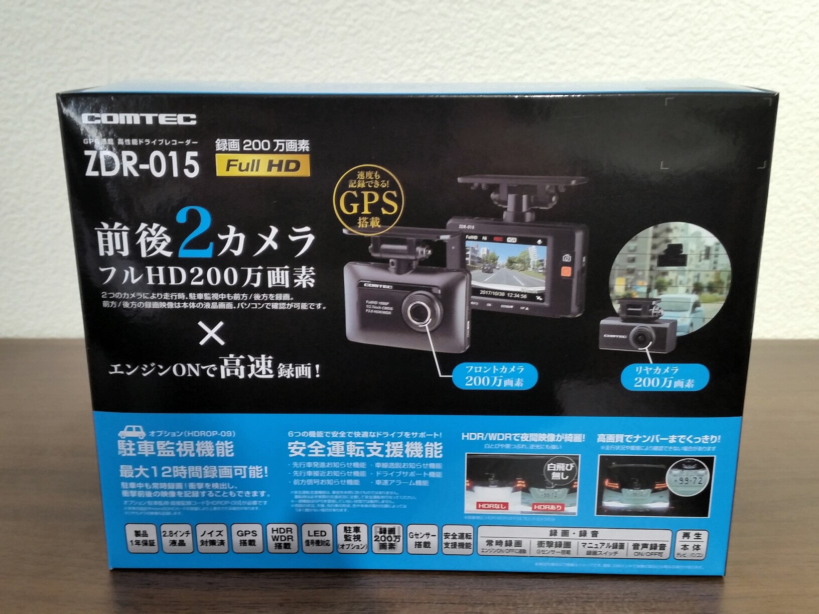 モデルは前後の2カメラで大人気、コムテックの”ZDR-015”です。