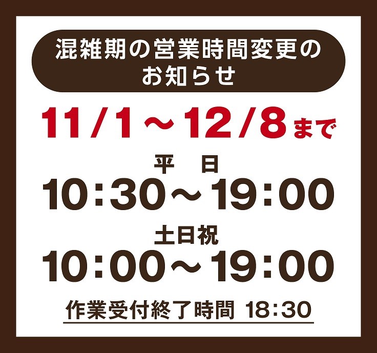 冬季期間 11/1(金)~12/8(日) までの間、営業時間が変更になります。