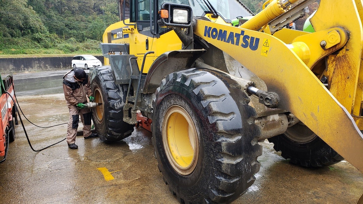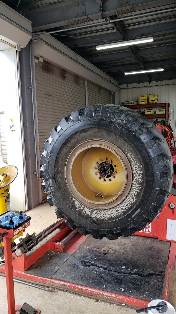 先週に雨の降る中ですが・・・0社様のタイヤショベルのリアタイヤ交換をさせて頂きました。