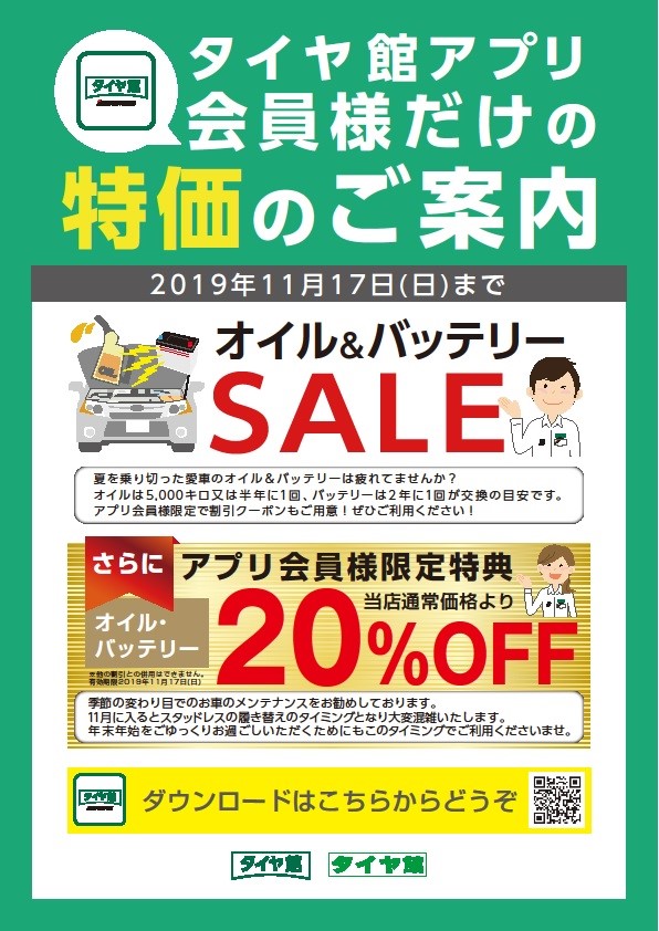 お・と・く・な・・・ ポスト 2019年10月31日 タイヤ館アプリはご存知ですか?? タイヤ館アプリ会員様だけのお得情報もあります!! 現在、アプリ会員に配信されている情報をちょっとだけ公開いたします(^^)/ アプリ会員に登録いただければ、すぐにこちらの割引が受けられます。 ぜひぜひこの機会にアプリ会員に入会してみてはいかがですか?? 皆様のお越しお待ちしてま~~~~~~~~~~す(^^)v 担当:ムラマツ