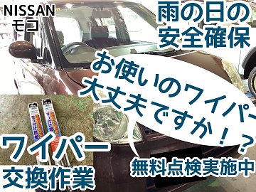 みなさんこんにちは☆ 雨の日の運転って 疲れたりしませんか? 走行中はワイパーが動いているので 視界がみえにくくて私は疲れます! 特に拭き取りが悪いと、なおさら疲れますよね? ワイパーも定期的な点検・交換が必要なのです!! そこで今回ご紹介するのは! 【NISSAN モコ】のワイパー交換作業...