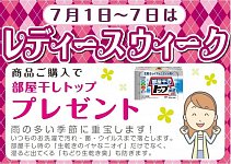 7月のレディースウィーク開催中! 女性ドライバーの方は、お得にクルマのメンテナンスができる1週間! セール期間中、メンテナンス商品ご購入で 「部屋干しトップ」プレゼント! 雨の多い季節、クルマのワイパーはしっかり拭き取りしてますか? ワイパーブレード1本からでも、気軽にご来店ください^^