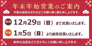 タイヤ館小千谷の ホームページをご覧いただき ありがとうございます。 年末年始営業のご案内です。 年内は12月29日(日)まで営業いたします。 年始は1月5日(日)より通常営業いたします。 12月30日(月)~1月4日(土)は 定休日とさせていただきます。 ご不便をおかけしますが お間違いのないよ...