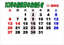 タイヤ館岡山東店のホームページ閲覧、ありがとうございます。 早いもので、10月に! 秋と言えば美味しいものが沢山出回る季節ですね(^^)/ さて、今月の当店 営業スケジュールですが 毎週水曜日が定休日となっております! 今月皆様のご来店・ご購入お待ちしております!!