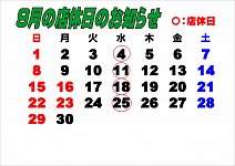 | 日 | 月 | 火 | 水 | 木 | 金 | 土 |