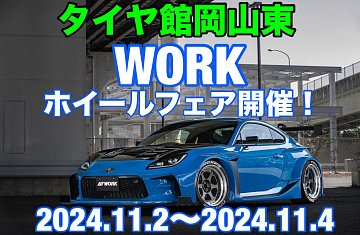 いつもタイヤ館岡山東店のWEBをご覧いただき 誠にありがとうございます! WORKホイールフェア開催決定!! 開催期間 11/2~11/4 大人気メーカーのWORKホイールが大集合!! WORK様ご協力のもと WORKホイールを大量展示させていただきます! この3日間はメーカー特別価格にて ご案内できますので 是...