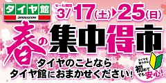 雨が続いてますね! 若干、肌寒い感じ・・・ 明日、21日は水曜日ですが営業いたします!! ただ今、タイヤ館岡山東店 春の集中得市 開催中!! ご来店お待ちしております♪