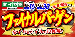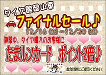今年最後、タイヤ館ファイナルセール!! 期間中、タイヤ購入のお客様にたまルンカード ポイント2倍!! たまルンカード、即日発行もできますよ!! ご来店お待ちしております。