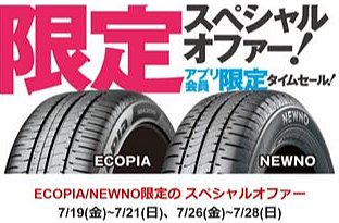 3台分限り! スペシャルプライスでタイヤ大放出します♪ すべてが限定!スペシャルなセール! 商品限定・期間限定・数量限定で タイヤをスペシャルプライスで お求め頂けるセールがはじまります!! エコピア・ニューノの各6サイズ限定 それぞれブリヂストンブランドの2種類から 以下のサイズのみ...