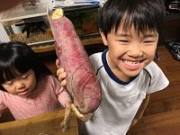 保育園の行事で子供達が芋掘りをしてきました! リュックを背負い登園した長男が誇らしげに帰宅して リュックから大きな薩摩芋を取り出しました! 頑張って掘ったらしいです(笑) 今夜は芋料理ですかね〜!?