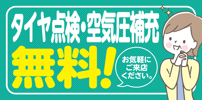 月に一度は空気圧点検!!! 最近、タイヤの空気圧点検はしましたか? 空気圧が減っていると燃費にもかかわってきます、、、 当店では無料でタイヤの点検・エアチェックを 行っております! お車に乗られたままでもエアチェックを 行っておりますので、 お買い物やお仕事帰りにでも、 お気軽にご来...