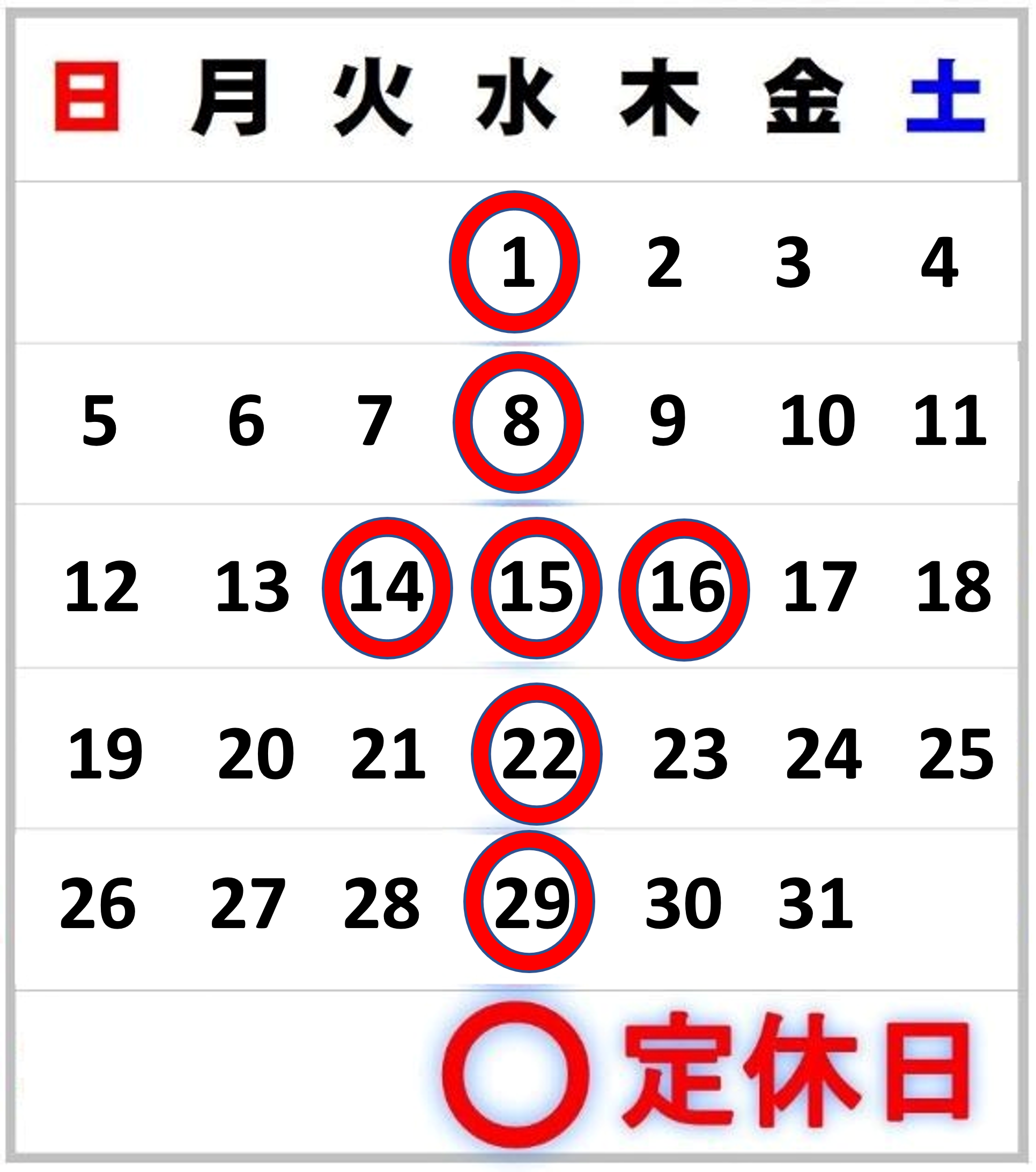 5月定休日のお知らせ