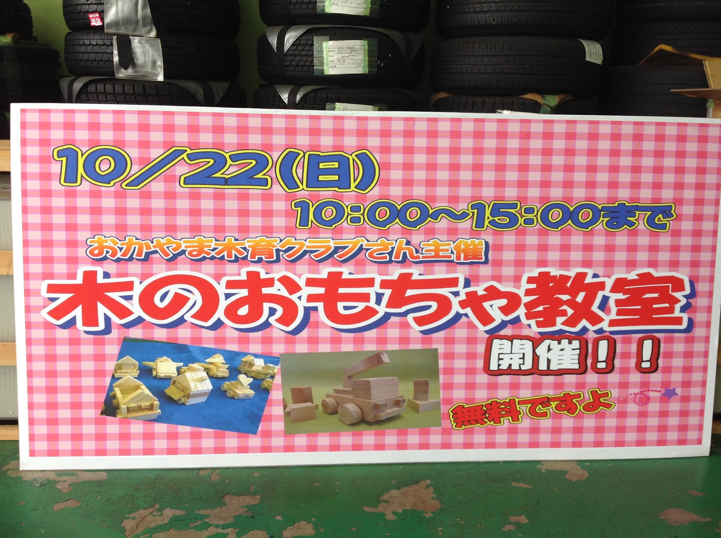 おもちゃ教室は22日限定、おかやま木育クラブさんが木の香りをここタイヤ館岡山西長瀬に運んで来てくれます。