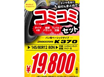 岡山県岡山市北区西長瀬にあります、タイヤ館岡山西長瀬店スタッフの八幡木です! いつも当店のWEBページをご覧いただきありがとうございます! コミコミ価格!! タイヤ4本と工賃込みの価格になります!!とてもお得です♪♪ タイヤサイズ 145/80R12 K370 (ハイゼット・キャリイ)等の車におすすめで...