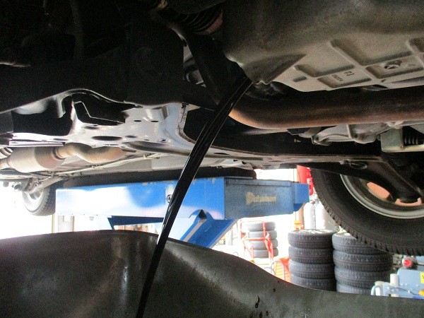 リフトアップ後は車両下側からオイルを抜いてボルトのパッキンを交換します。