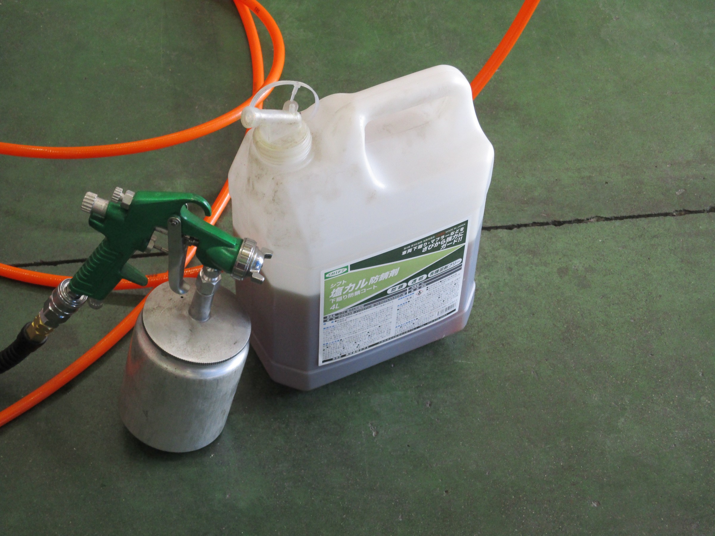 こちらが下回りに吹きかける防錆コート剤とスプレーガンです。