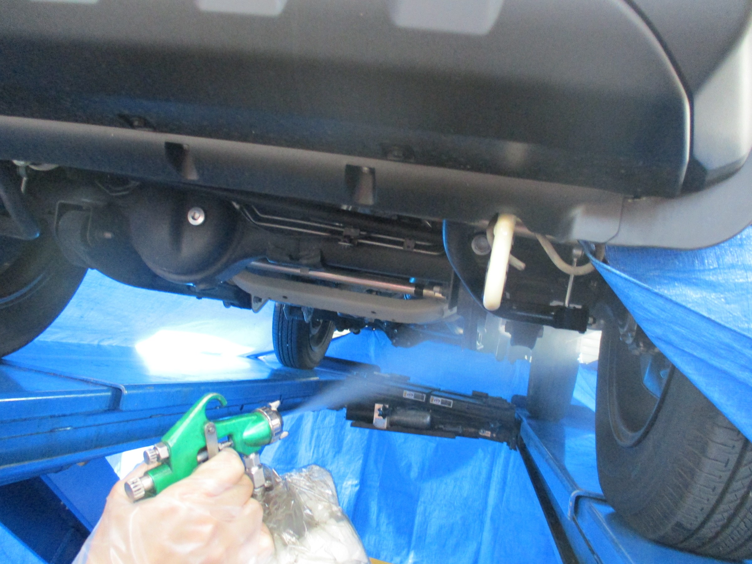 車両下部の金属部分に防錆剤を吹きつけていきます