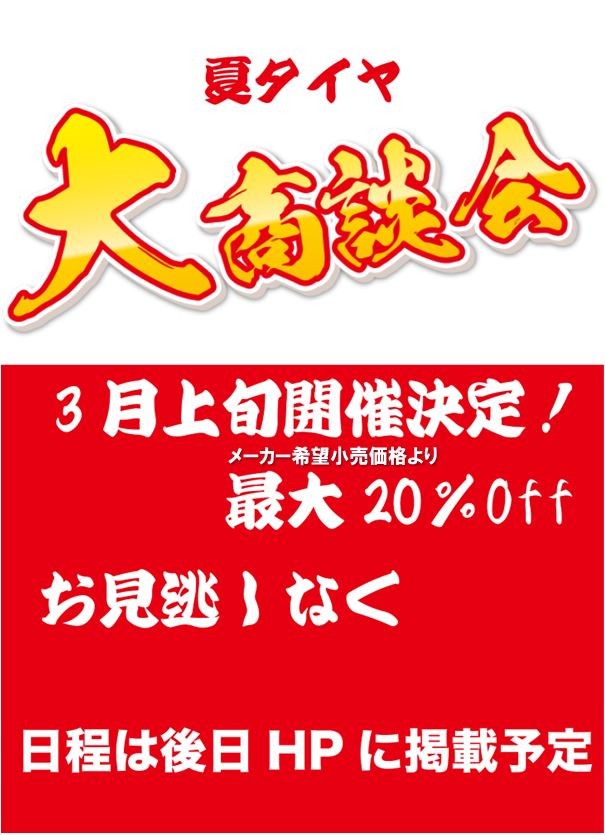 【予告】夏タイヤ大商談会!開催決定!! ポスト 2025年2月9日 タイヤ館奥田店です! いつも当店をご利用いただき、ありがとうございます。 イベント開催決定!!! タイヤ館 奥田 住所:930-0811富山県富山市千代田町9-15 電話番号: 076-444-1225 タイヤ点検・安全点検/タイヤ履き替え/オイル交換/その他ピット作業の予約