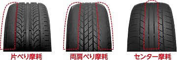 偏摩耗していませんか? タイヤの接地面に極端にすり減っている箇所がないかを点検しましょう。タイヤの偏った摩耗は、空気圧が適正でなかったり、 タイヤローテーションをせずに使用していた場合に起こりやすくなります。 タイヤの寿命を延ばし、車の異常を見つける為に。 定期的(5000km走行に1回...