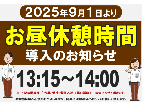 10:30~13:15 14:00~19:00 (9/1より昼休憩13:15~14:00)(作業受付18:00まで)