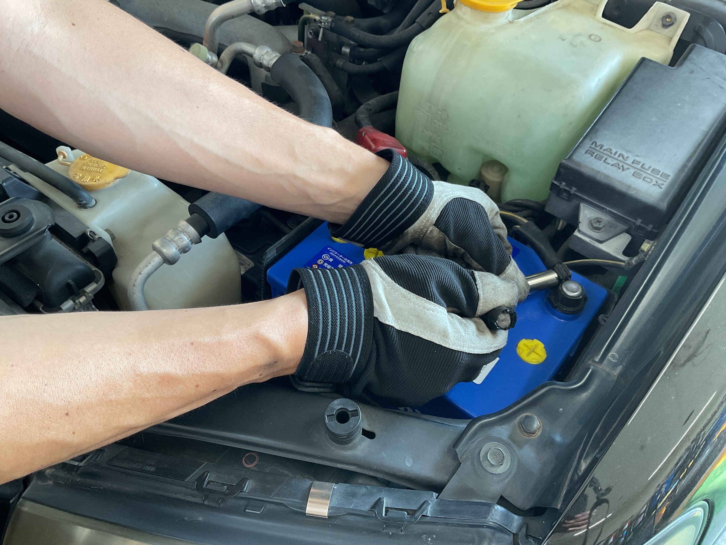 交換手順は①ステーの取り外し ②マイナス端子の取り外し ③プラス端子の取り外しです。