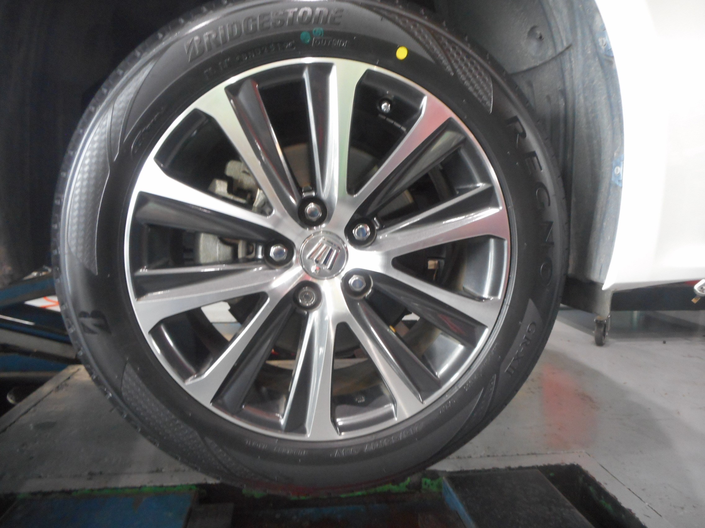 4輪ともに点検させて頂き、やはりショルダー部分にクラックが発生しているのと、ゴムの硬度がかなり固くなってしまっていて、またタイヤ内側のショルダー部分に偏摩耗が見られたところから、4本のタイヤ交換と4輪アライメント調整を行いました。