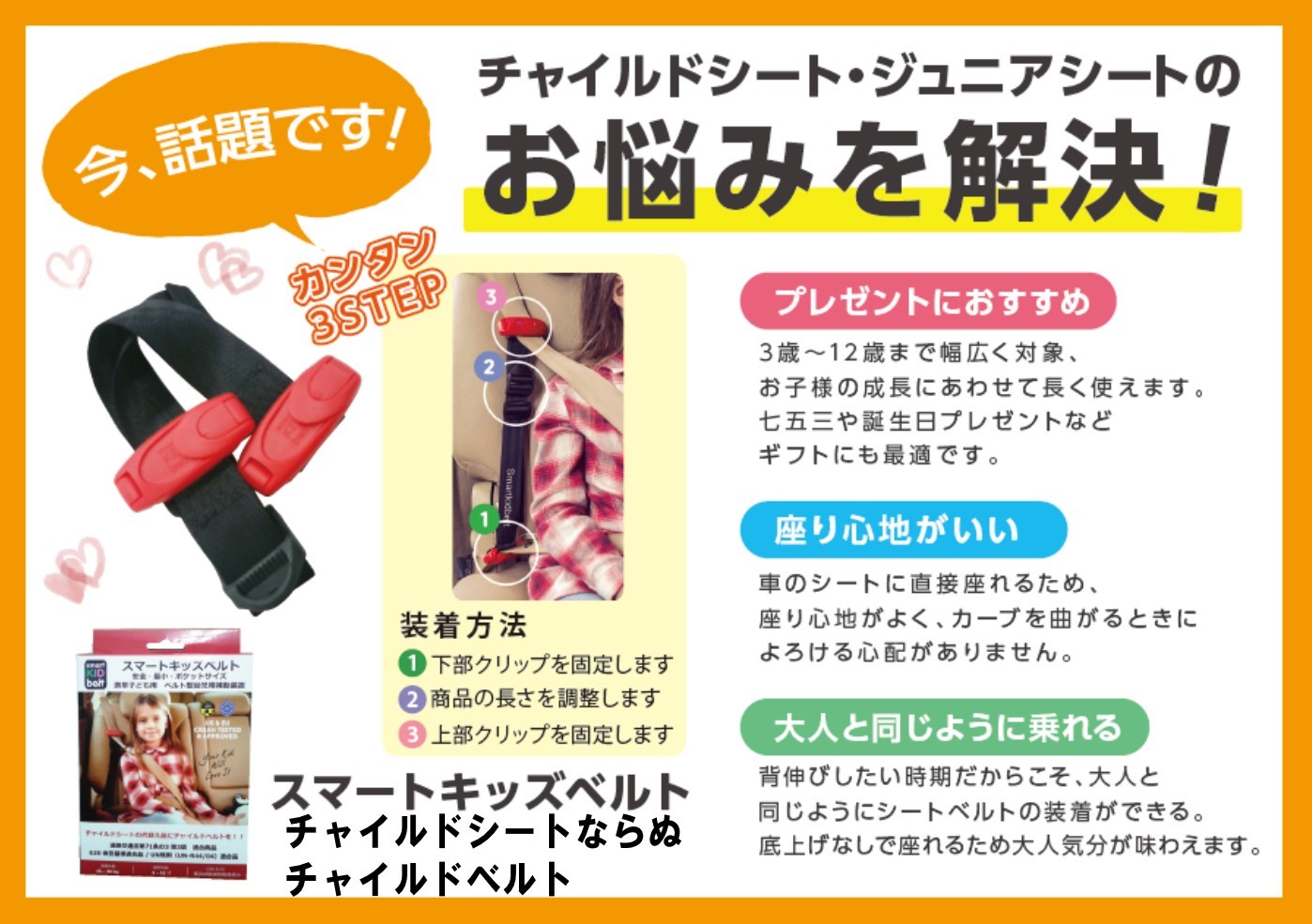 スマートキッズベルトをつければベルトが肩の位置にきてしっかりと体を支えることが出来、安全です。↓