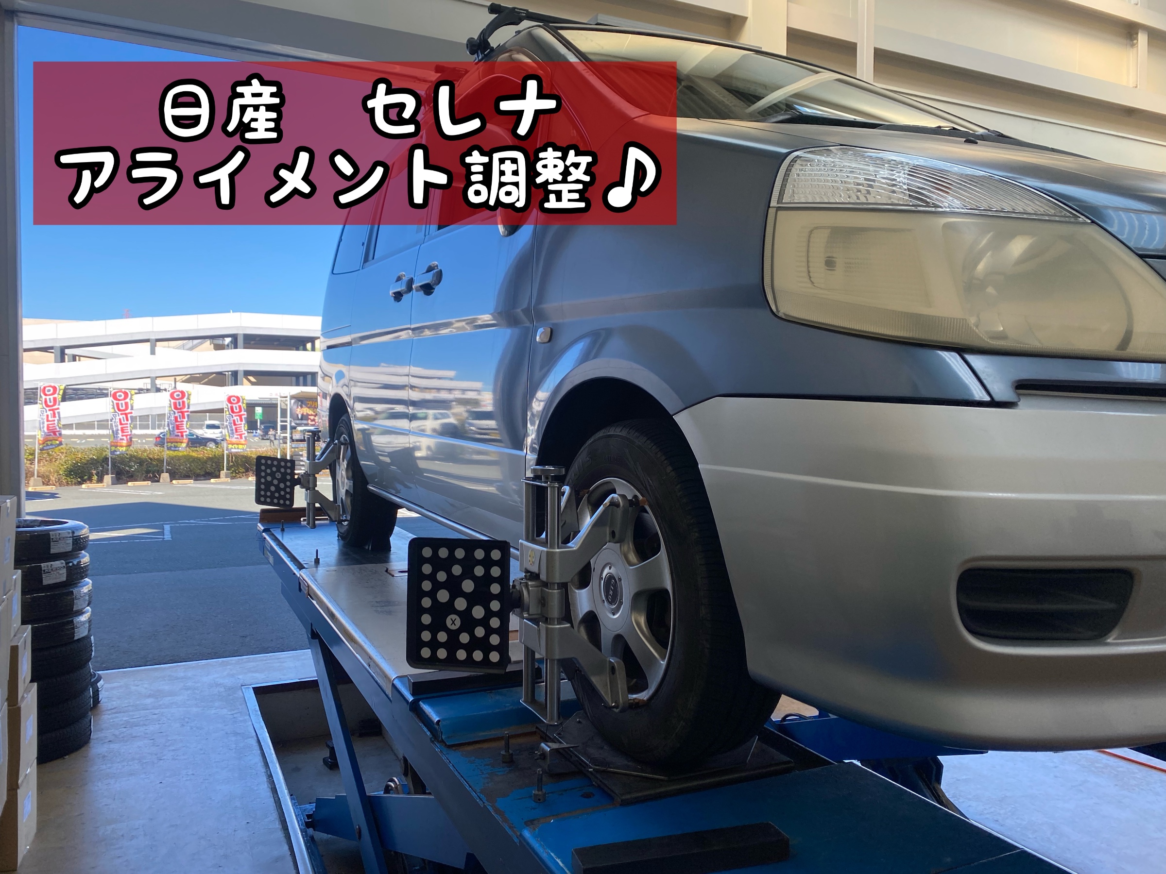 タイヤ館イオンモール大牟田店の川島です。今回は日産セレナのアライメント調整をさせていただきました。