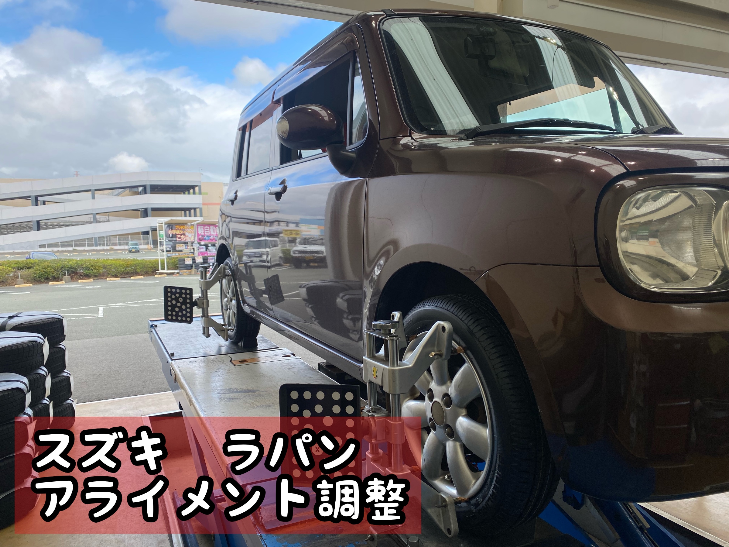 タイヤ館イオンモール大牟田店の川島です。今回はスズキ・ラパンのアライメント調整をさせていただきました。