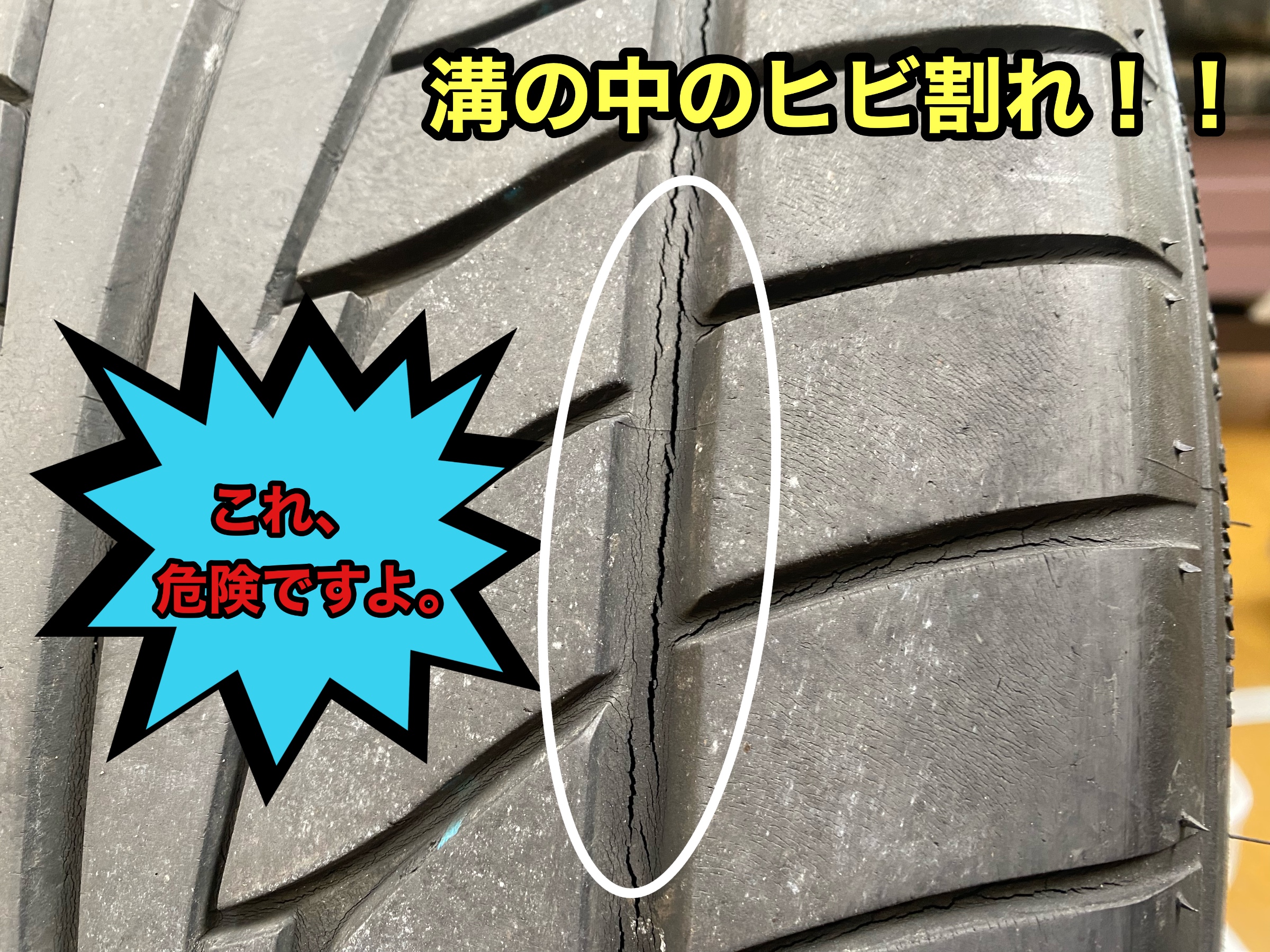 写真のタイヤも溝はまだ残っていますが、ヒビ割れが目立ちます。