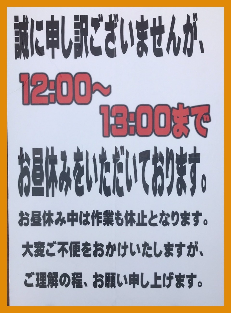 お昼休み時間帯 (12:00~13:00)をお昼休憩時間とさせていただいております。