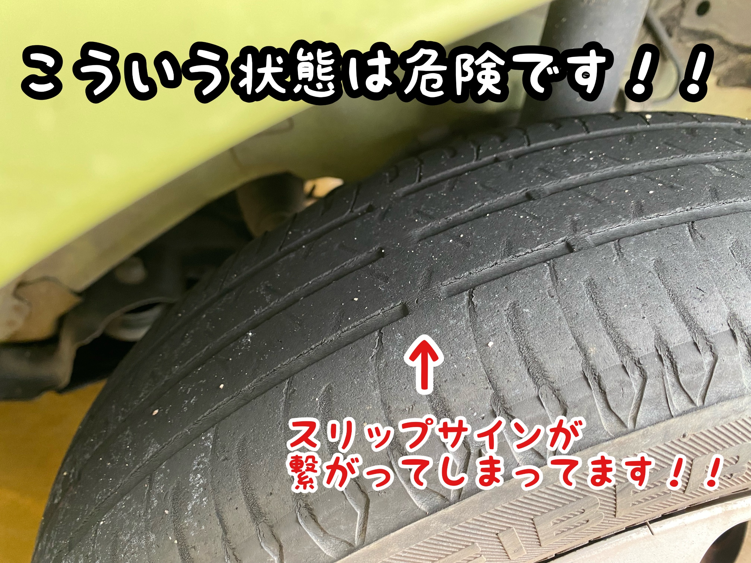 タイヤの溝にはスリップサインという出っ張りがありますので、安全のためには、これが繋がってしまう前には交換してください。