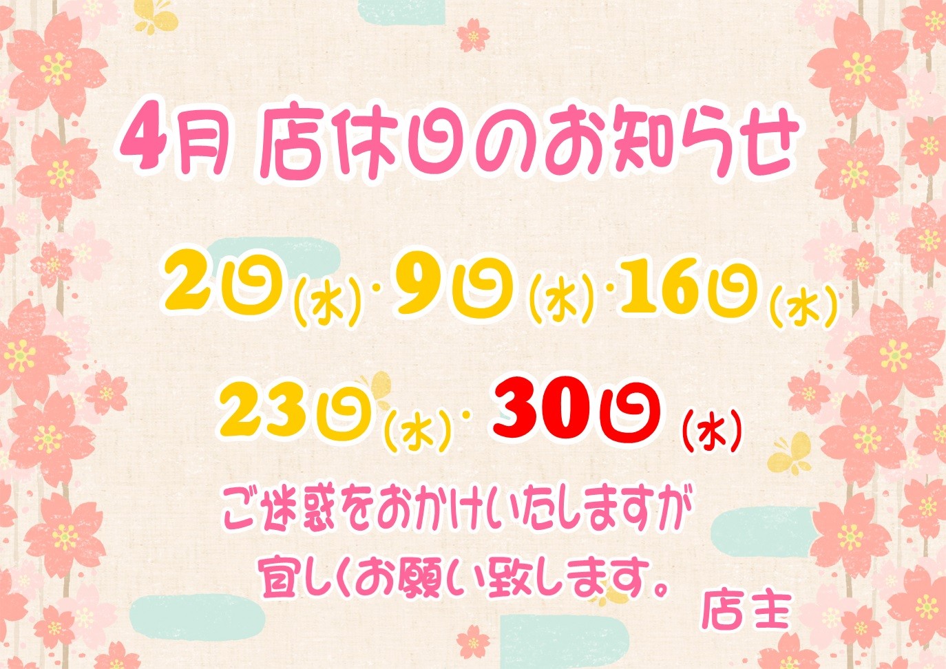 4月の店休日追加のお知らせ
