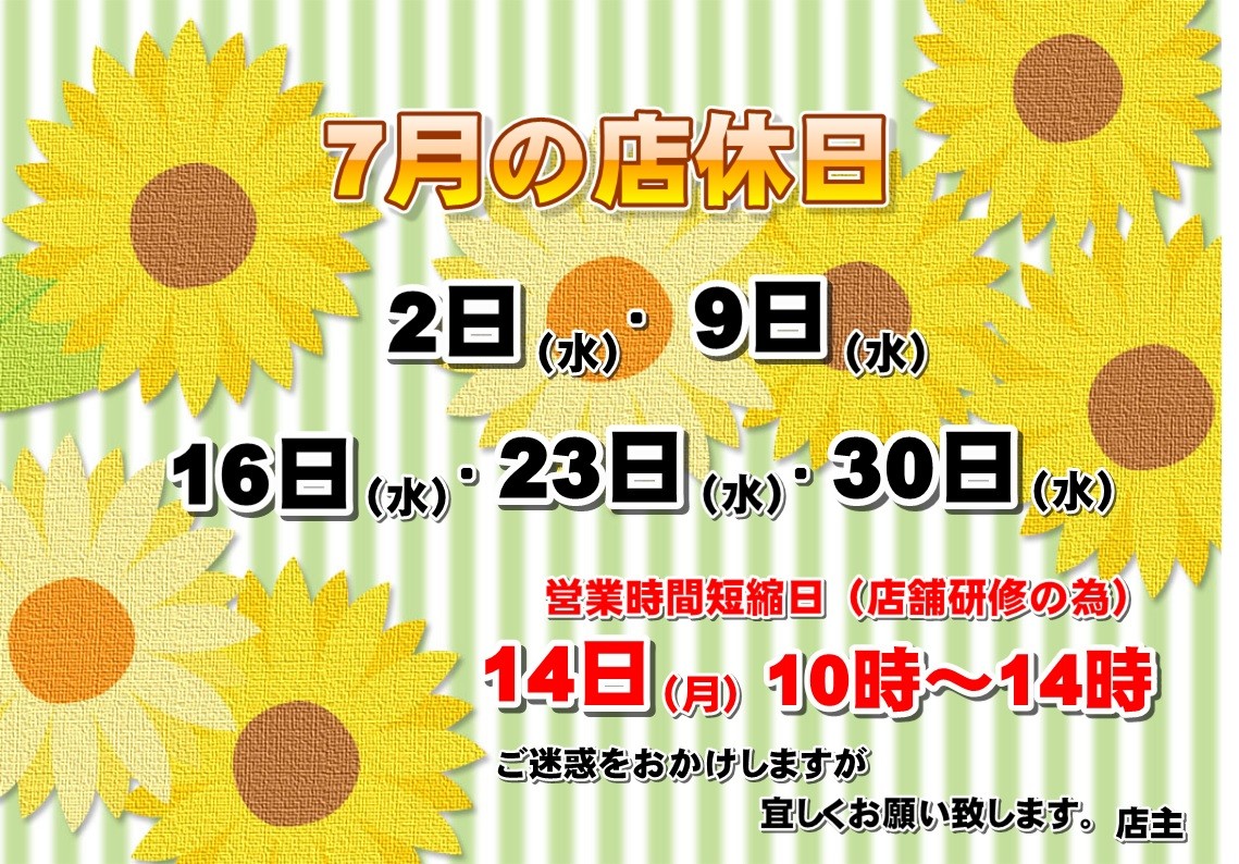 ☆7月の店休日・営業時間短縮日のお知らせ☆