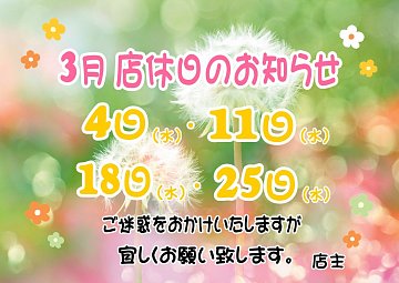 ☆3月 店休日のお知らせ☆