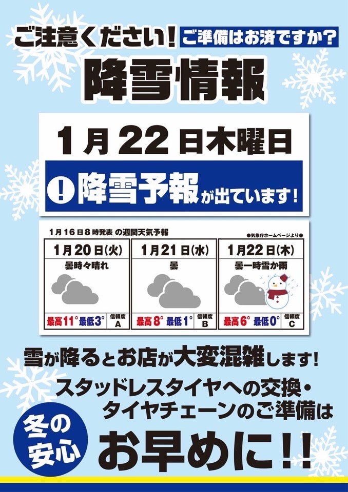 タイヤ館イオンモール大牟田店の本村です! 降雪予報発令中!雪が降ってからでは交換待ちが発生する可能性があります。「まだ大丈夫」ではなく、「今のうち」が安心です。スタッドレスタイヤ・タイヤチェーンの準備はお早めに! タイヤ館 イオンモール大牟田店に、一度ご相談ください! 時短したい...
