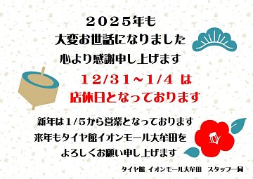 いつも大変お世話になっております。タイヤ館 イオンモール大牟田店 店長の本村です。 いよいよ年の瀬も迫り、お忙しい日々をお過ごしのことと存じます。本年は格別のご愛顧を賜り、厚く御礼申し上げます。 来る年もさらなるサービス向上を目指し、スタッフ一同より一層の努力をしてまいりますので...