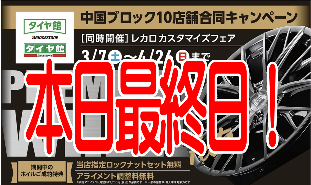 アルミホイールイベントは今日まで!! ポスト 2026年4月26日 こんにちはタイヤ館おのみち店です。 Raysさんをメインに開催した今回のイベントも、本日が最終日となります。 今回のイベントの様子です。 イベントは本日で終了しますが、アルミホイールをお探しの方はお気軽にご来店下さい。 各種メーカー扱っておりますので、ご相談に応じます。 これから連休に入りますので、お出かけ前の点検も実施しております。 尾道・福山でタイヤ・ホイール・アライメント・メンテナンス商品の事ならタイヤ館おのみち店にお任せ下さい。
