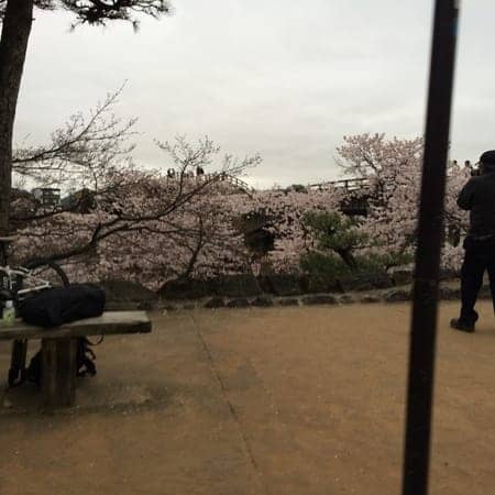 桜が満開の状態で、後ろの錦帯橋が隠れてしまってますね(^^)
