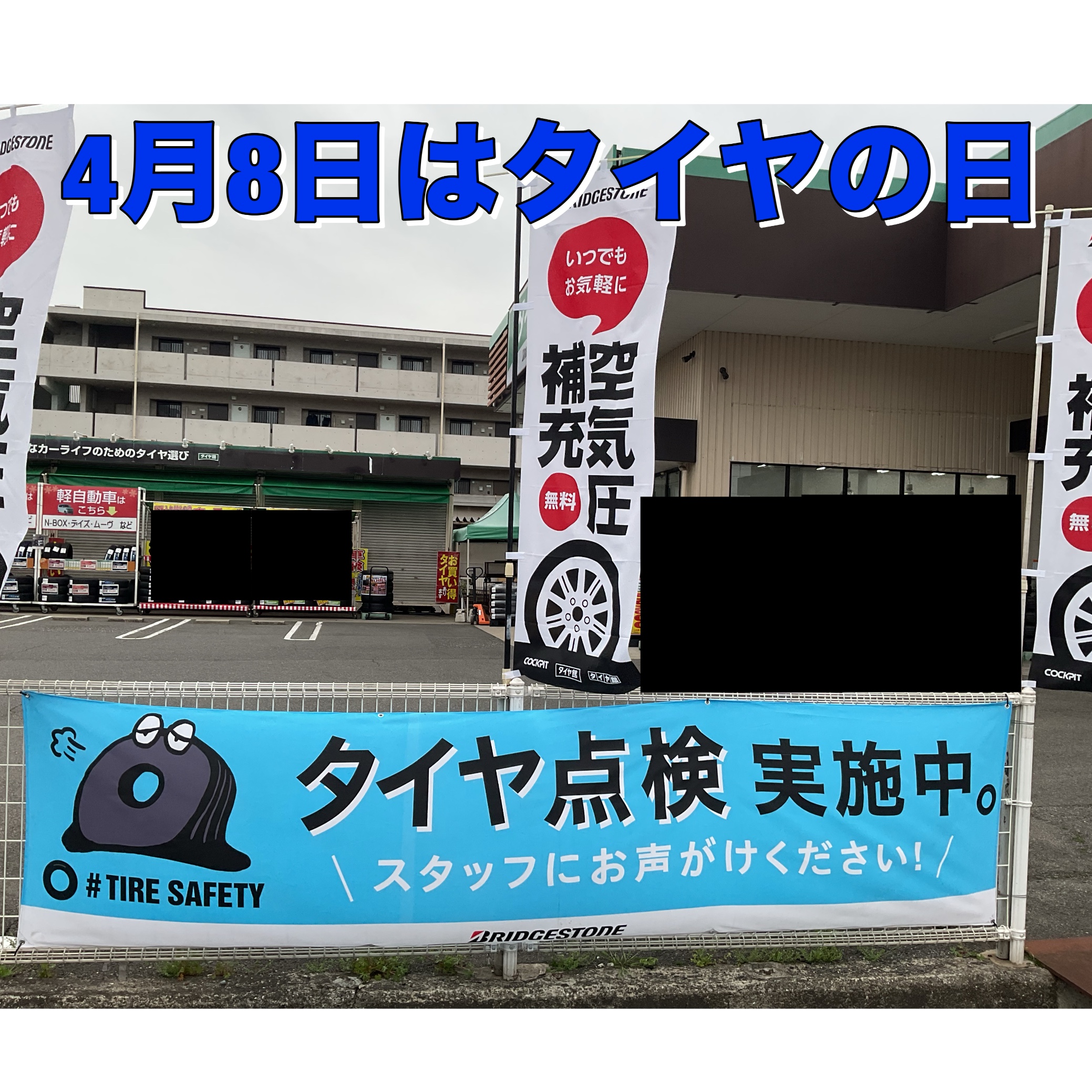4月8日はタイヤの日! ただいまお客様の安心安全のためにタイヤセーフティー活動やってます! 空気圧補充を実施していますので、空気圧補充だけでもどうぞ!