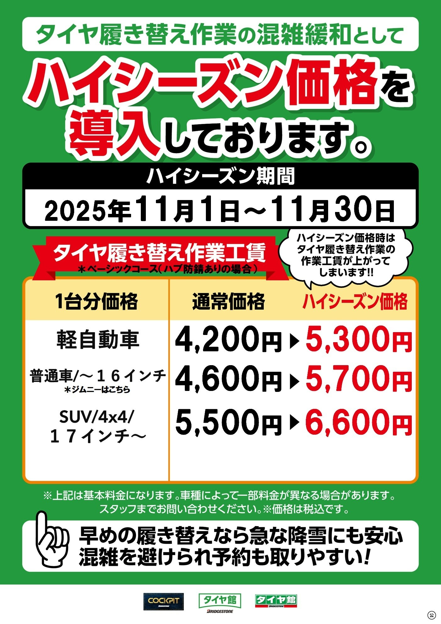 【11/1~11/30】はタイヤ交換(脱着)作業はハイシーズン料金となります。