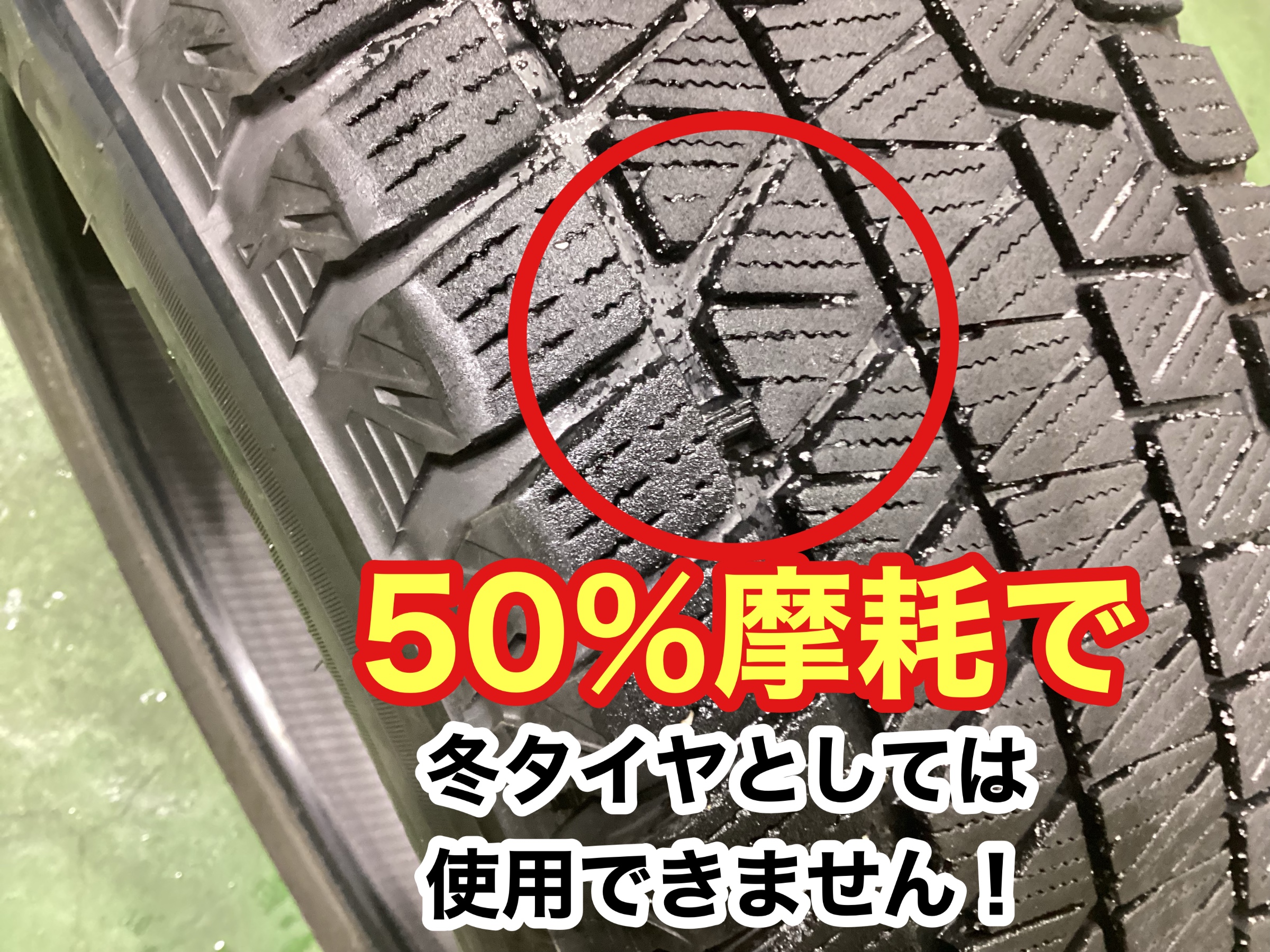 50%摩耗しているスタッドレスタイヤです