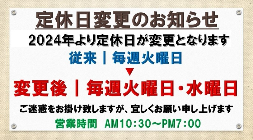 従来定休日は毎週 火曜日となっておりましたが2024年より