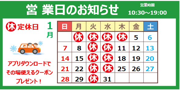 1月は9日(火)10日(水)16日(火)17日(水)23日(火)24日(水)30日(火)