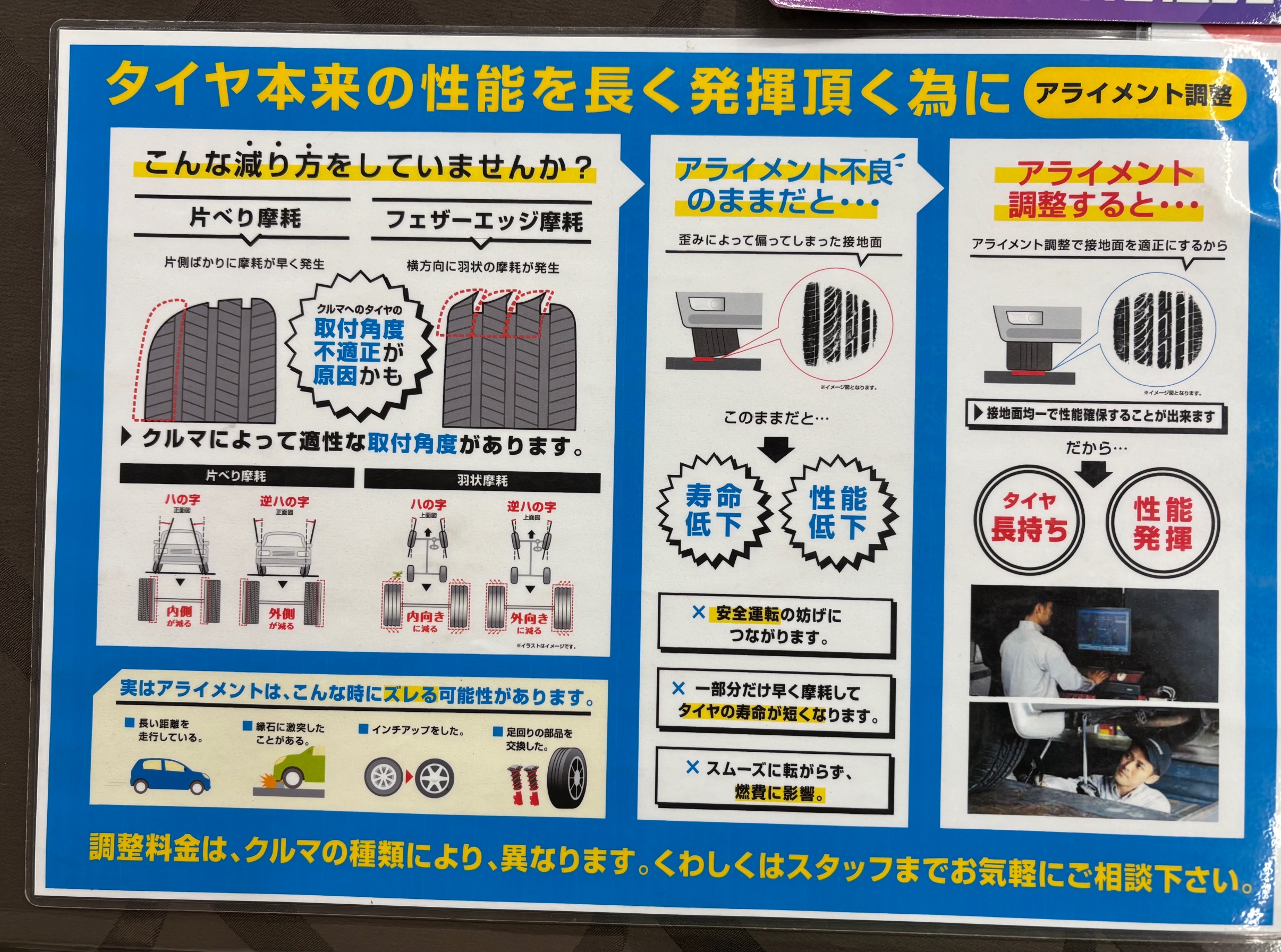 アライメント調整 ポスト 2025年6月6日 こんにちは^_^ タイヤ本来の性能を長く発揮する為に アライメント調整 アライメント調整すると、 アライメントが不良だと 寿命低下、性能低下につながります❗️ アライメント測定、調整は ぜひタイヤ館へ 担当:川一