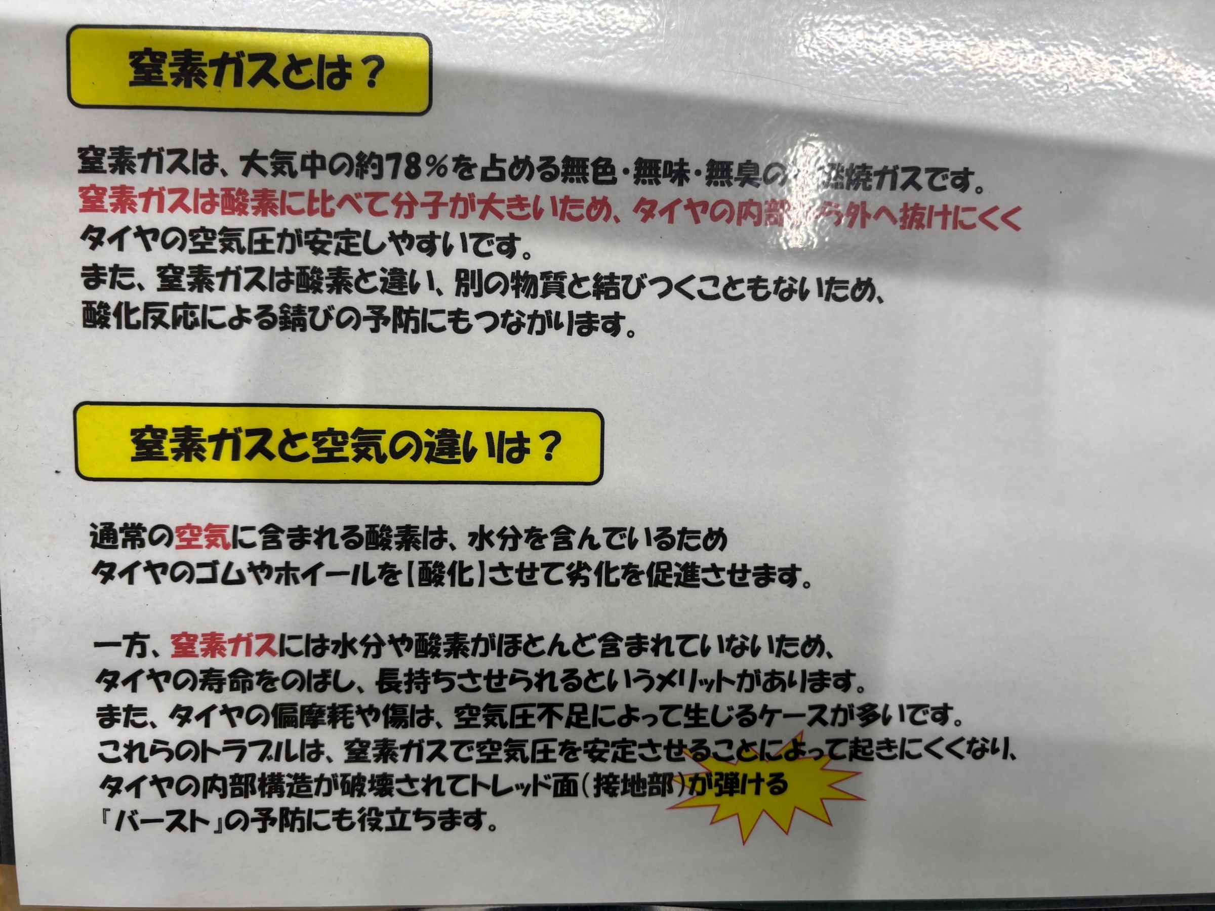 窒素ガス ポスト 2025年8月29日 こんにちは^_^ 窒素ガスはご存じですか? 窒素ガスは酸素に比べて分子が大きいため、 タイヤ内部から外に抜けにくいです❗️ 窒素ガスには水分や酸素がほとんど 含まれてないため、タイヤの寿命をのばし、 長持ちさせられるメリットがあります。 担当:川一