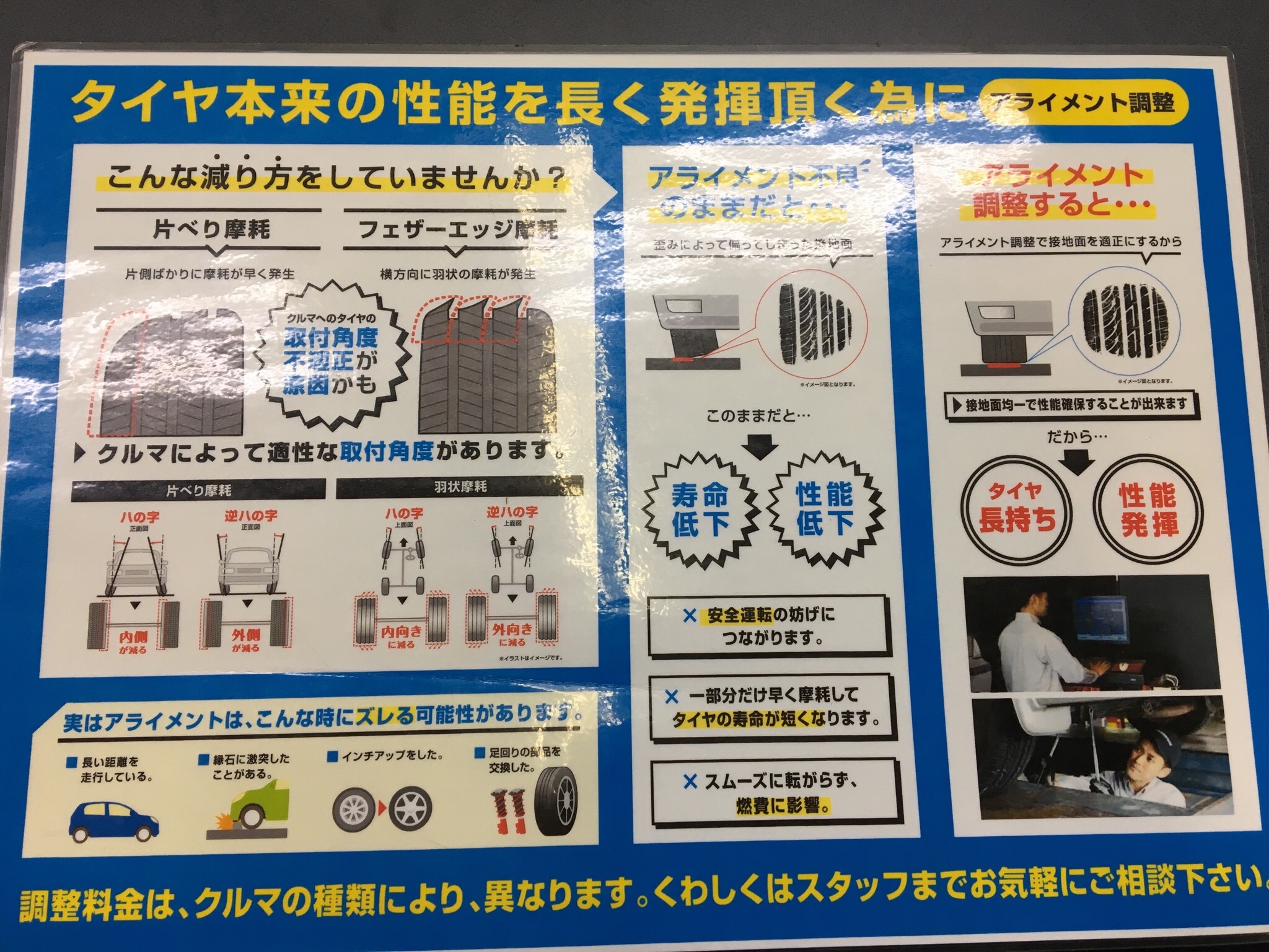 アライメントの大事さ! ポスト 2019年6月20日 アライメントはご存知ですか? アライメントはタイヤの車軸を調整する作業です アライメントをする事でタイヤの長持にも 繋がります(^^) 定期にアライメントの点検を^ ^ 担当:川ー
