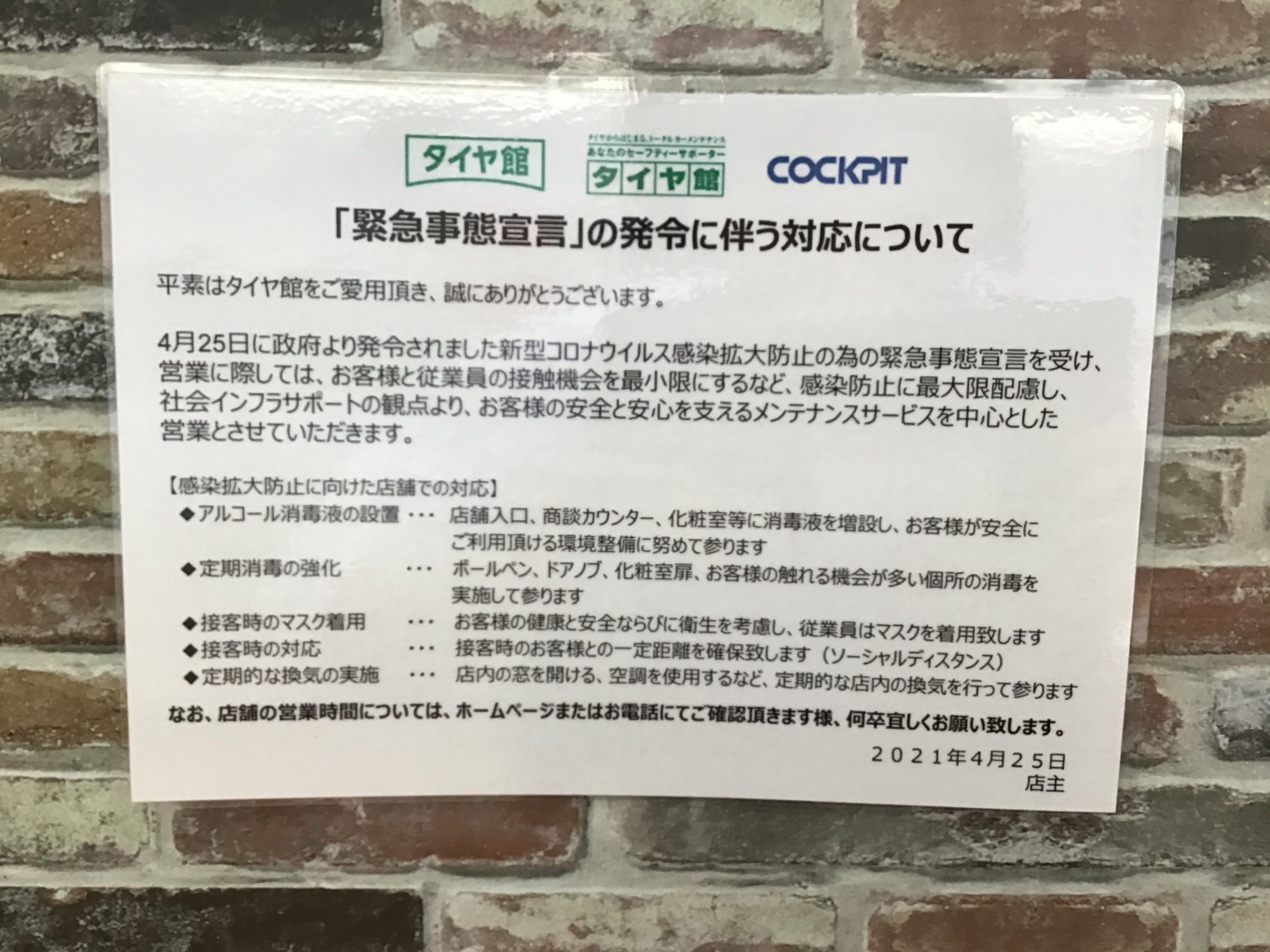緊急事態宣言発令に伴うご対応について ポスト 2021年4月26日 おはようございます!! タイヤ館和泉の日記をご覧頂きありがとうございます!! 本日4月25日に再発令されました緊急事態宣言についてのご案内です。 当店は通常通り営業致しておりますが、上記記載の内容を実施させて頂いております のでご安心してお立ち寄りください。 担当:古川