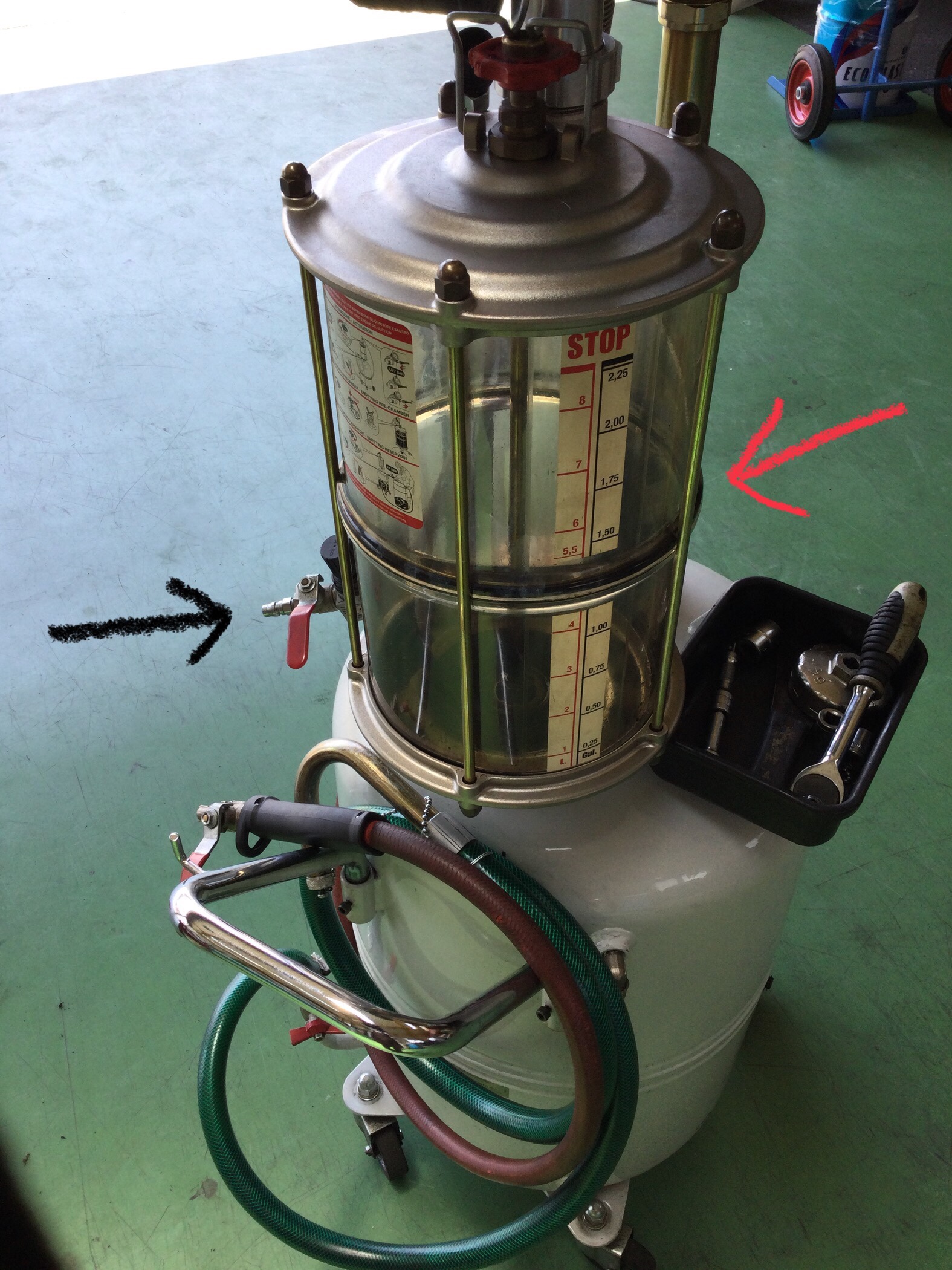 上抜きの場合、オイルレベルゲージ抜き吸引ノズルを差し込み、黒い矢印にエアーホースを装着し空気の力でオイルを吸い出します。抜けたオイルは、赤い矢印に溜まり量も確認出来ます。