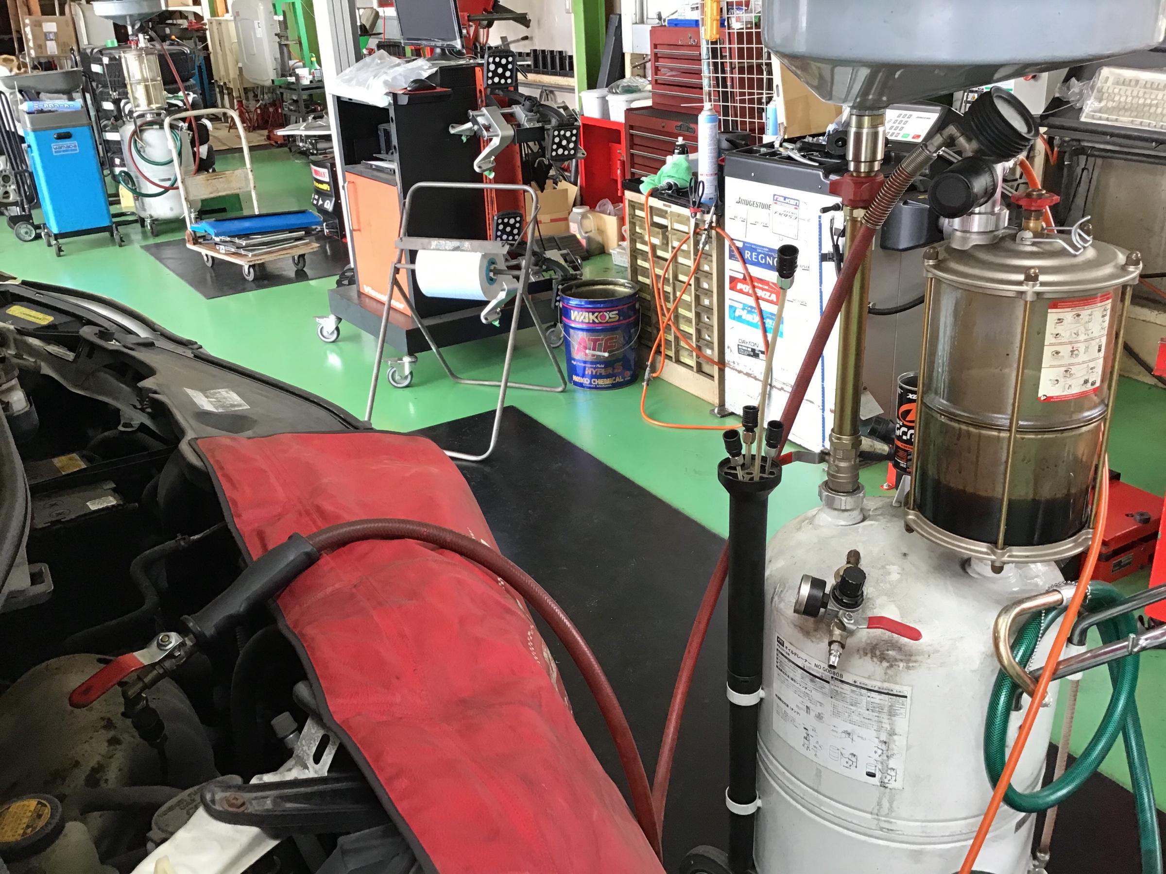 お車にもよりますが、ドレンボルトを外してもポタポタ出ないぐらい抜けますよ〜。(上抜きできない車種もあります。詳しくはスタッフまで。)